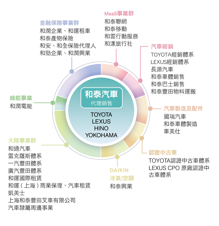 跨足汽車經銷、汽車製造及配件、認證中古車、金融保險、MaaS 事業、海外投資等