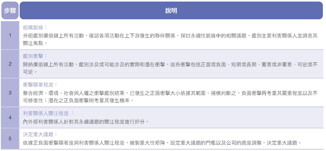 與 2023 年比較,2024 年重大議題並無變動。鑑別結果呈報永續主管,經核准後於揭露公司於該議題的管理方針以及永續作為。