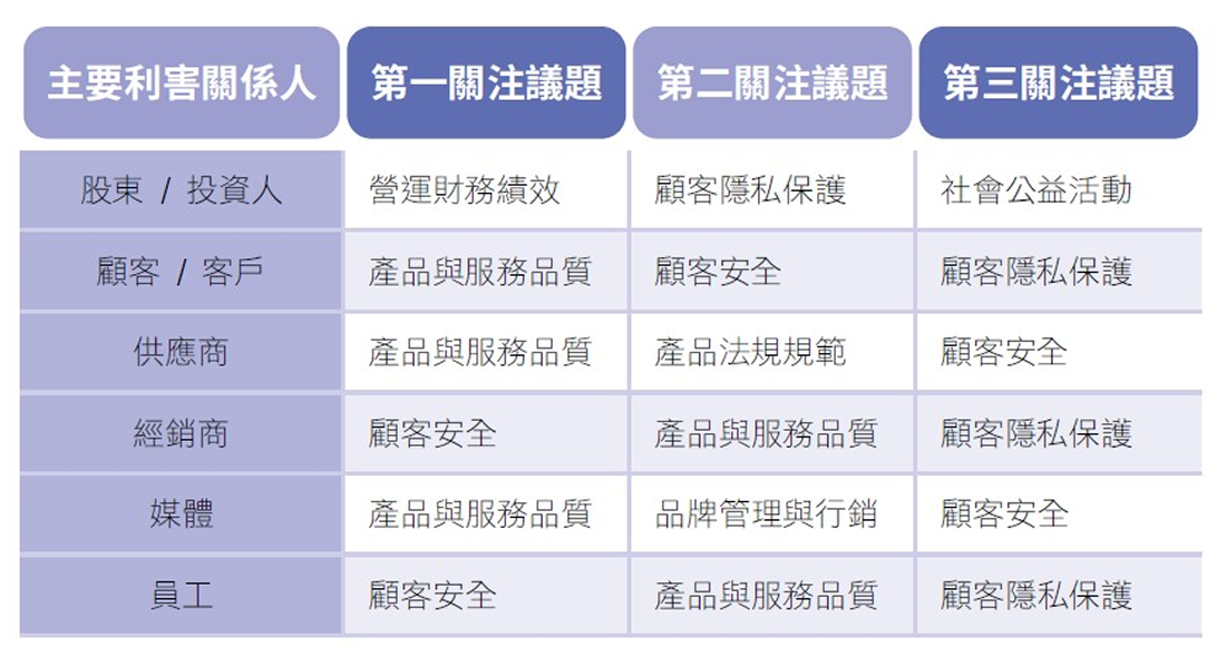 此外,發送「利害關係人關注程度問卷」予 6 類主要利害關係人,透過闡明每項永續議題實際與潛在正負面衝擊情境,調查其對 22 項永續議題的關注程度。將各永續議題評分結果計算平均值,並將其排序。各類主要利害關係人之首三名關注議題如下表所示: