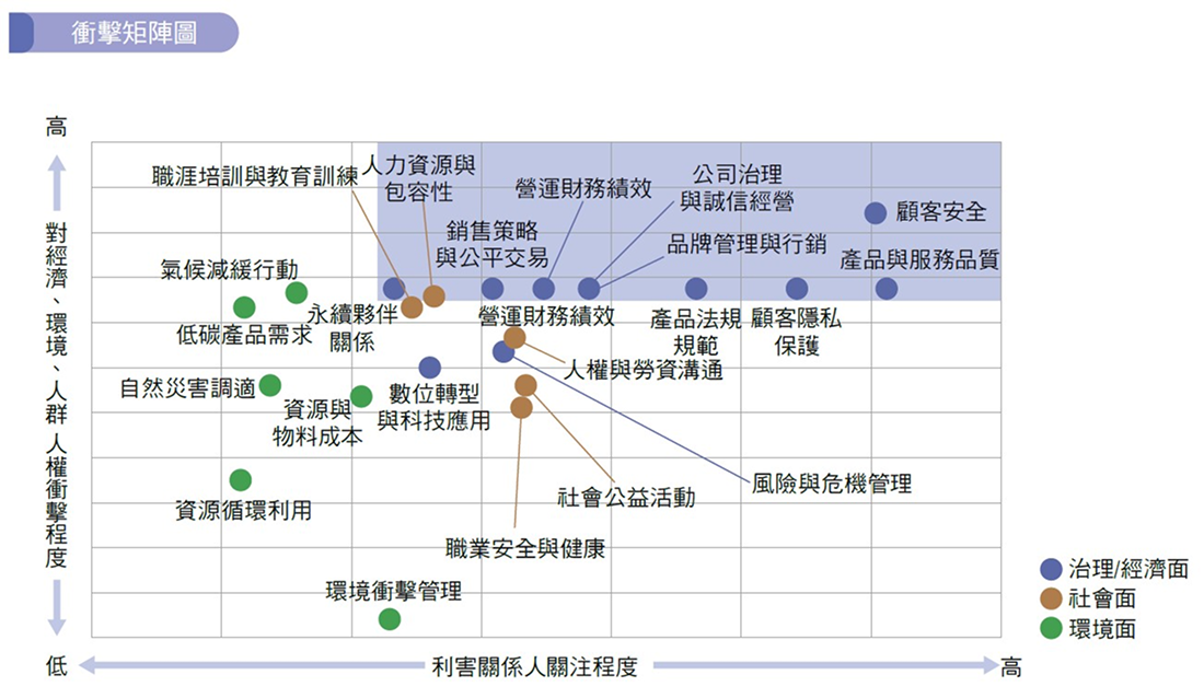 在衝擊顯著程度的鑑別過程中,我們分為每項永續議題之正面衝擊和負面衝擊進行評估,正面衝擊考量因素包含實際衝擊(規模、範圍)及潛在發生可能性,而負面衝擊考量因素則包含實際衝擊 ( 規模、範圍、不可修復性 ) 及潛在發生可能性。評估衝擊顯著程度及利害關係人關注程度發送「永續議題衝擊評估問卷」讓各部門主管同仁針對 22 項永續議題對經濟、環境、社會(人權)的正面衝擊與負面衝擊進行評分。將各永續議題之正負面衝擊影響程度及發生機率平均值相乘,再將正負面乘積值相加並依得分高低排序。
