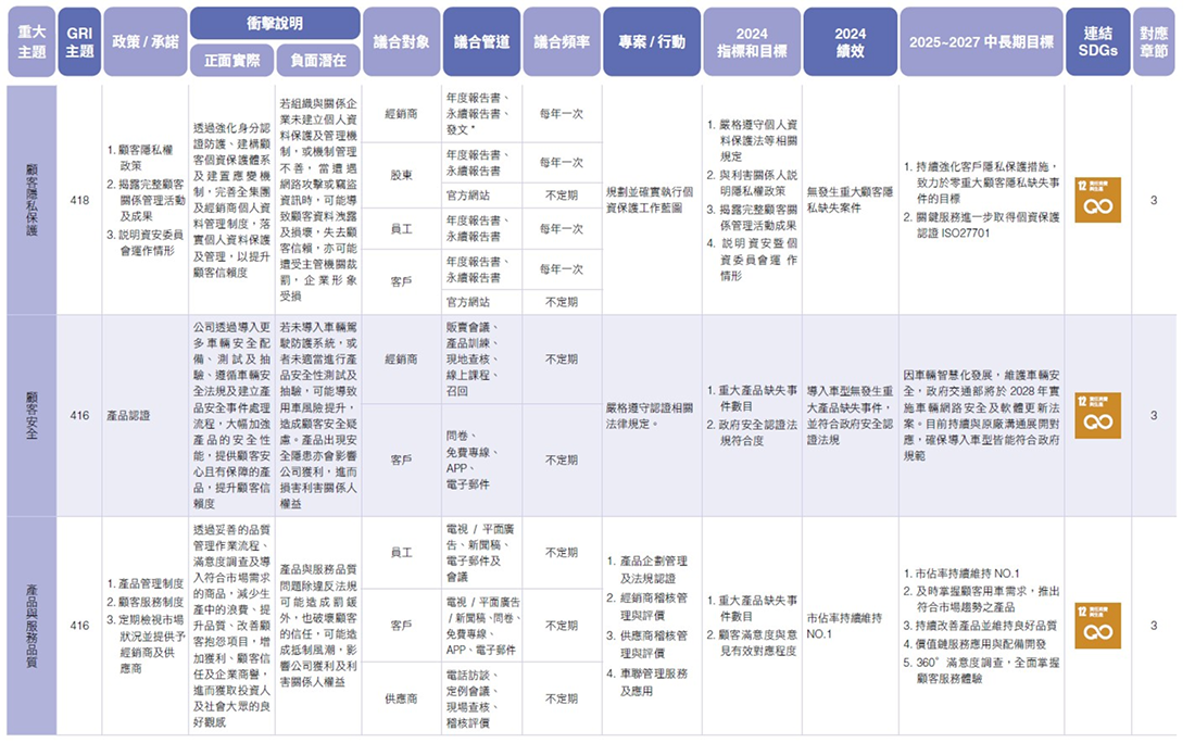 針對矩陣圖結果,公司進行內部討論,並參考外部顧問的意見,其中考量「職涯培訓與教育訓練」、「氣候減緩行動」、「人權與勞資溝通」的負面衝擊顯著度得分較高、公司需要持續投入資源管理以預防或減緩其潛在負面衝擊 ; 「職業安全與健康」的管理妥善與否對保障員工的身心健康以及遵守台灣相關法規至關重要 ; 另和泰汽車多年來積極投入多樣社會公益行動,且「社會公益活動」為永續藍圖發展方針 M.O.V.E 的重要一環,因此決定酌幅調整前述 5 個議題的重要性。綜上,初步重大議題鑑別結果為最高重要性的 10 個議題,即「顧客安全」、「顧客隱私權保護」、「產品與服務品質」、「品牌管理與行銷」、「人力資源與包融性」、「職涯培訓與教育訓練」、「氣候減緩行動」、「人權與勞資溝通」、「社會公益活動」、「職業安全與健康」。