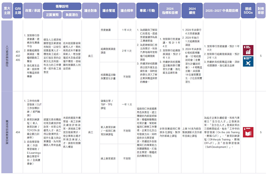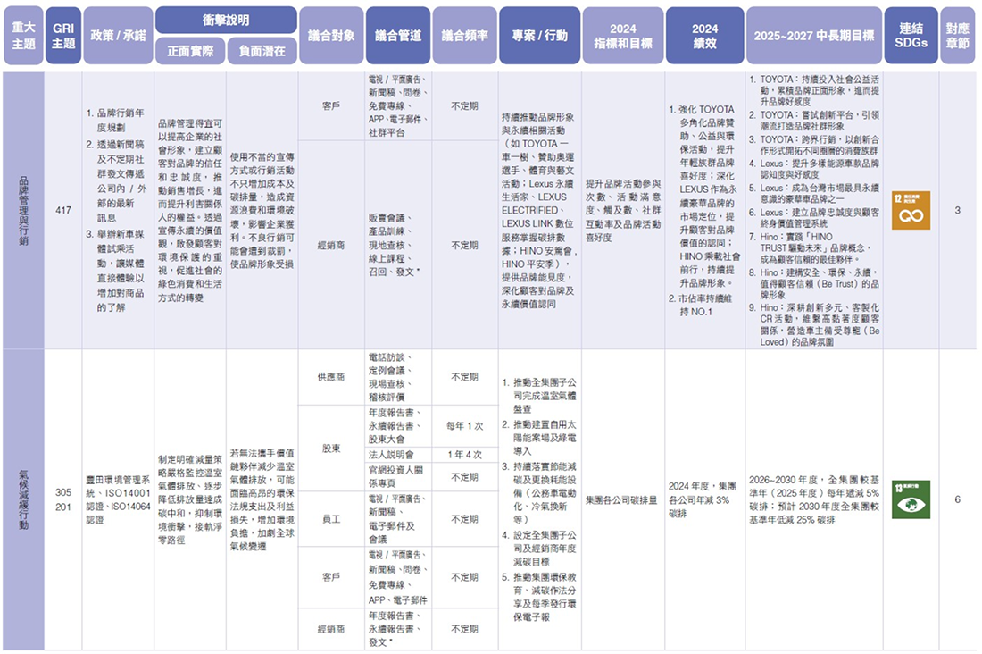 和泰汽車致力於將各項永續議題與長期策略、風險和機會相結合,為主要利害關係人創造價值。和泰汽車認為,永續成長和穩定是提升公司價值的關鍵管理重點,持續提供滿足客戶需求的產品是解決這些優先事項的關鍵。在企業社會責任方面,我們以利害關係人為導向進行管理,促進永續發展,並努力保持和發展良好的溝通管道。