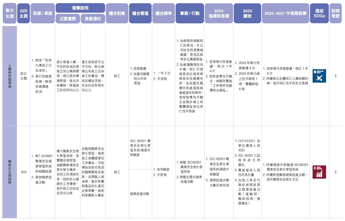在蒐集永續議題時,和泰汽車以總公司、新莊與楊梅營業據點為考量邊界,遵循 GRI 準則(Global Reporting Initiative(GRI)Standards)所建議的永續性脈絡與重大性分析原則。除了參考國內外企業社會責任的相關準則與報告書編撰規範,包括 GRI 準則、UNGC(United Nations Global Compact)、TCFD(Task Force on Climate-related Financial Disclosures)、SASB(Sustainability Accounting Standards Board)、ILO(International Labour Organization Conventions and Recommendations)、SDGs(Sustainable Development Goals)與 ISO 26000 外,亦考量永續發展的風險與機會、利害關係人回饋、汽車產業特有趨勢以及外部顧問專家建議的議題,歸納出環境(E)、社會(S)和治理(G)三大類共 22 項永續議題,並對其進行經濟、環境、社會與人權的正負面衝擊評估。