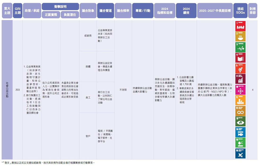 除 10 項重大議題外,2024 年報告書亦持續揭露「永續夥伴關係」、「公司治理與誠信經營」、「風險與危機管理」及「低碳產品需求」議題的永續作為及績效。
