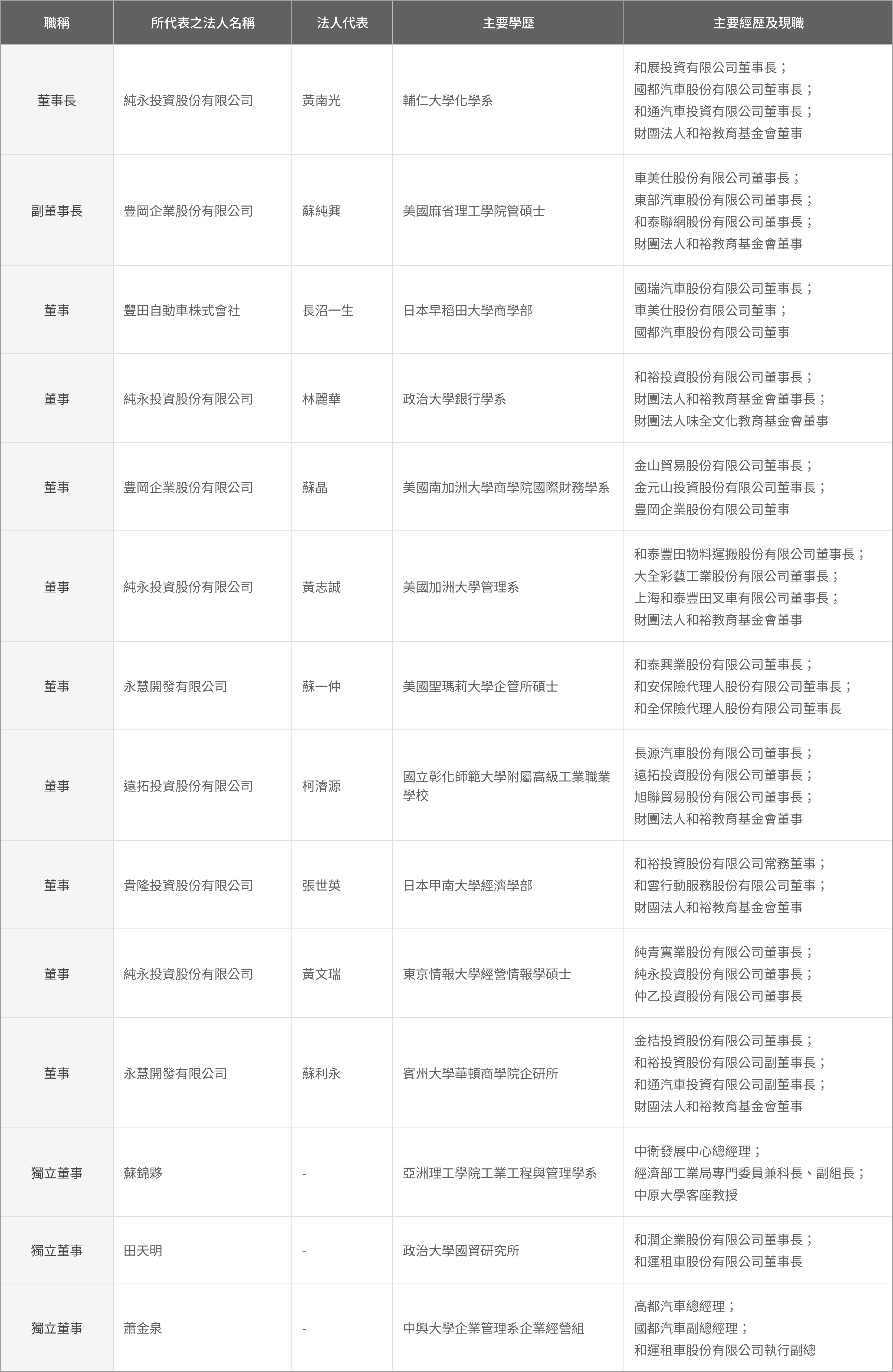 114 年共有14 位董事,其中3 位獨立董事,佔比為21.4%。董事成員中有2 位董事任本公司員工(蘇純興總經理、⾧沼一生執行副總經理)。每位董事在候選人資格條件審查皆無違反公司法第三十條所列各款情事之確認事項,相關受理作業皆依法進行及公告。全體董事及相關個人簡歷,包括成員之間的關係(未超過半數之席次董事有配偶、二親等以內之親屬關係),載於113年年報。