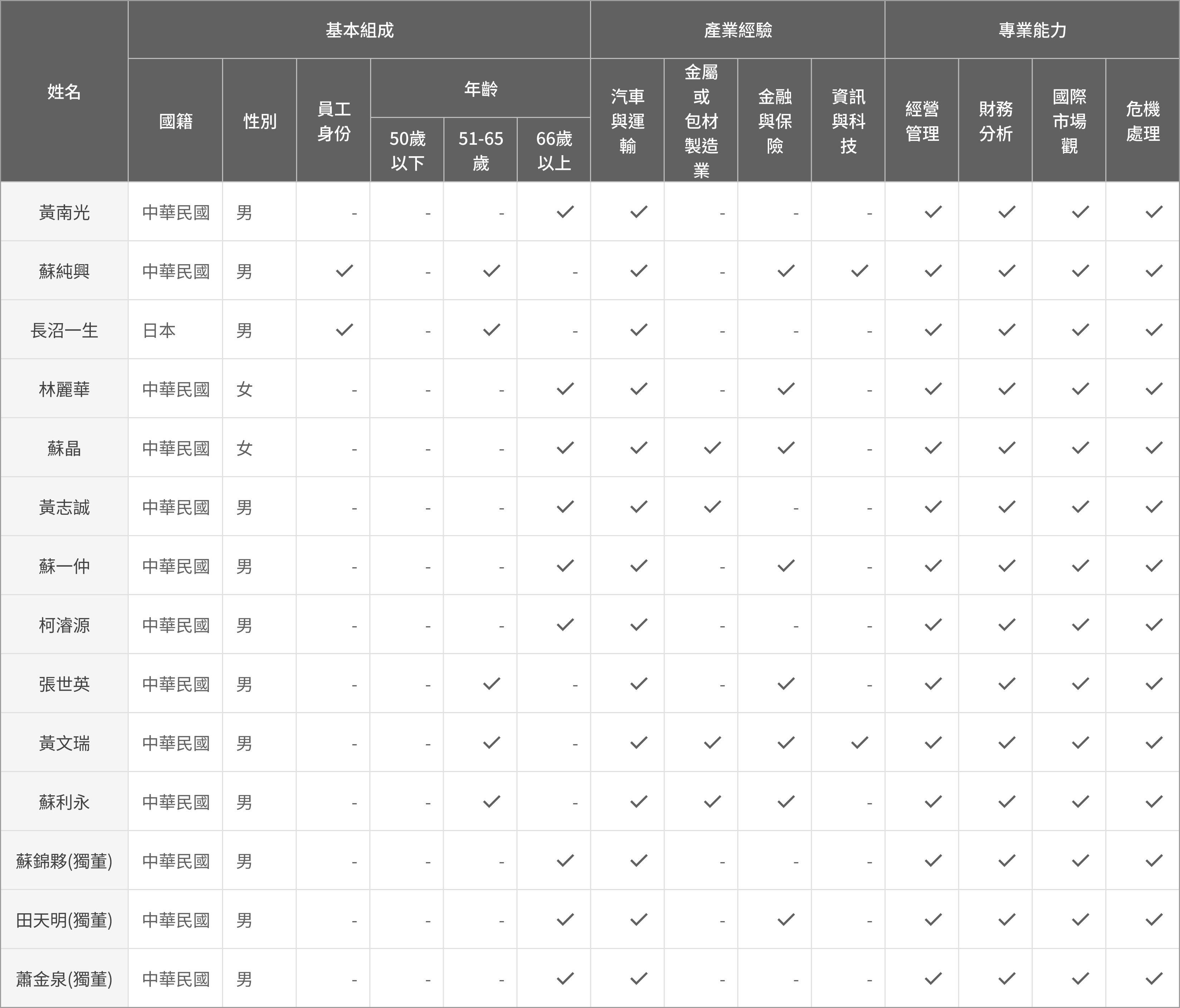 董事成員之選任均以用人唯才為原則,具備跨產業領域之多元互補能力,包括基本組成(如:年齡、性別、國籍等),也各自具有產業經驗與相關技能(如:金融保險、資訊科技等)。