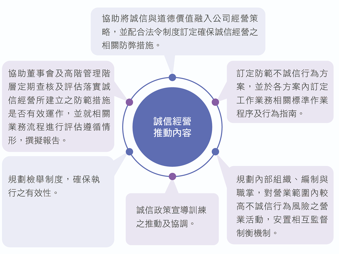 「正直誠信」是和泰的企業文化核心,為落實誠信經營,由法務室擔任誠信經營推動專責單位,推動誠信經營事項,並由稽核室監督執行並定期向董事會報告運作情形。
