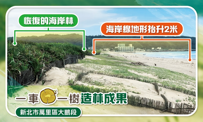 新北市萬里大鵬段海岸造林透過堆砂籬、防風圍籬及水寶盆技術,恢復林地且整體地形抬升2公尺 (圖:慈心基金會提供)