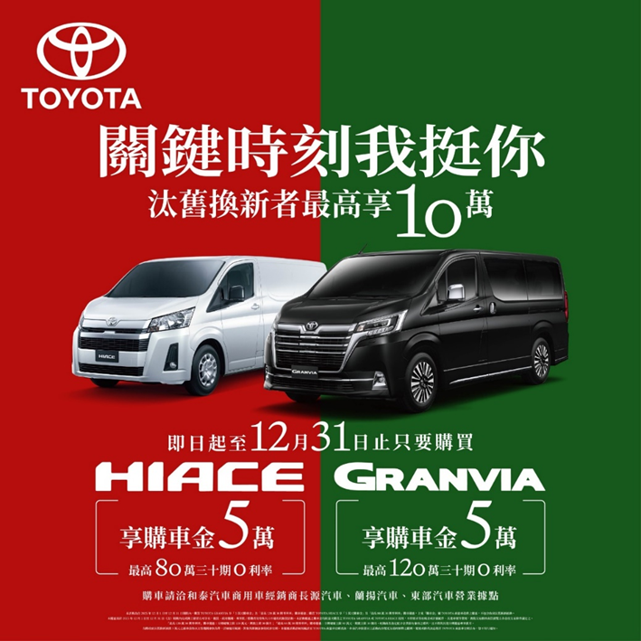 TOYOTA商旅車「關鍵時刻我挺你」限時購車優惠,即日起至2025年12月31日止,購買TOYOTA GRANVIA即享「5萬元購車金」及「最高120萬30期零利率」;購買TOYOTA HIACE即享「5萬元購車金」及「最高80萬30期零利率」優惠