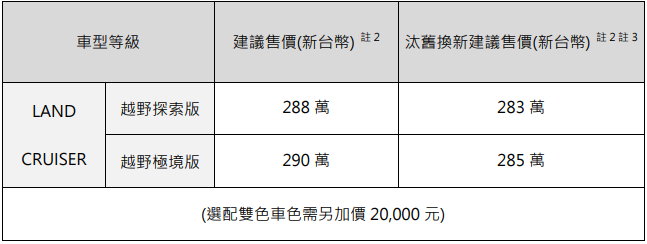 LAND CRUISER延續高品質、耐用可靠的造車理念,打造出越野玩家專屬多元變化座艙,兼具日常實用性與戶外越野機能,展現出真正能滿足多元生活型態的全方位越野座駕。為了符合台灣市場的熱烈迴響,和泰汽車將持續與TOYOTA日本原廠積極爭取配額,誠摯邀請消費者親臨展間,實際了解LAND CRUISER的無畏魅力,相關車款資訊亦可上TOYOTA 網站查詢:https://www.toyota.com.tw/showroom/LANDCRUISER/ ,如有購車需求可至以下網址留下您的聯繫資訊,後續將有專人與您聯繫 : https://www.toyota.com.tw/crmarketing/2025_LC/