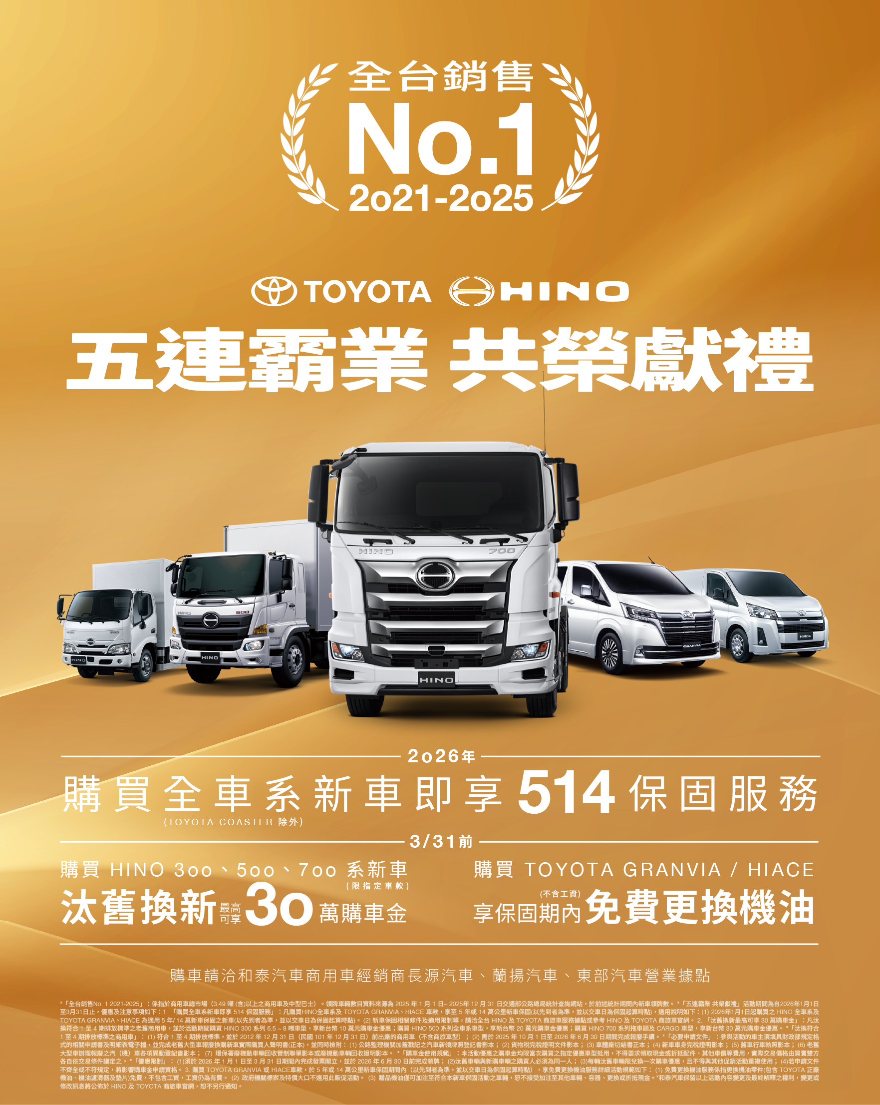 2026.01.02和泰商用車蟬聯銷售冠軍,推出「五連霸業 共榮獻禮」感恩回饋 購買指定車款享5年14萬公里新車保固、保固內免費換油、汰舊換新最高30萬購車金等多項優惠2026年01月02日 和泰商用車榮獲商用車銷售冠軍五連霸,推出「五連霸業 共榮獻禮」購車優惠,感謝車主長期支持 和泰商用車以深獲信賴的品牌價值、完整的商品陣容與穩健的販賣服務體系,成為顧客最安心信賴的商用車夥伴,2025年和泰商用車3.49噸(含)以上市場登錄6,611台註1,市佔率37.6%,再創佳績,連續五年(2021~2025年)榮獲商用車總市場銷售冠軍五連霸註1,於廣大車主的支持下,再創市場領導里程碑。為感謝全台車主長期以來的肯定,2026年推出「五連霸業 共榮獻禮註2」感恩回饋活動,以更完善的保固服務與更有感的購車優惠,回饋所有車主。 「五連霸業 共榮獻禮」優惠開跑,購車即享5年/14萬新車保固(以先到者為準),汰舊換新購買HINO車系最高可享30萬購車金 「五連霸業 共榮獻禮註2」於2026/1/1起購買HINO全車系及TOYOTA GRANVIA、HIACE車款,即享5年或14萬公里新車保固註3(以先到者為準),全面守護所有顧客。另於2026/1/1至3/31期間,凡汰換符合1至4期排放標準之老舊商用車,並購買HINO 300系6.5~8噸,享NT$10萬元購車金、購買HINO 500系全車系,享NT$20萬元購車金、購買HINO 700系拖車頭及CARGO車型,享NT$30萬元購車金回饋註2。 TOYOTA商旅車優惠再加碼,購買TOYOTA GRANVIA、HIACE,再享5年/14萬保固期內(以先到者為準)免費更換機油 TOYOTA商旅車款亦推出超強購車優惠,於2026/1/1至3/31期間購買TOYOTA GRANVIA或HIACE車款,除同步享有5年或14萬公里新車保固(以先到者為準),更可於保固期間內享「免費更換機油」服務,大幅減輕車主後續保養負擔,提供更完善的用車照護。本次免費更換機油零件項目包括TOYOTA正廠機油、機油濾清器及墊片更換註2。 HINO商用車提供多元車型與噸數選擇,全方位滿足顧客多元載運需求 HINO商用車系提供從3.49噸到46噸一應俱全的完整商品線,靈活滿足車主多元需求,HINO車款動力性能表現強勁且展現卓越穩定性,並導入多項先進安全配備,例如: E-Mirror電子後視鏡、BSM盲點偵測系統、BSIS內輪差警示系統、PVM環景影像輔助系統、TPMS胎壓偵測系統等註4,全面提升駕駛安全性和車輛可靠性。 TOYOTA商旅車擁有卓越操控性能及靈活座艙空間,為商務、旅行最佳首選 TOYOTA GRANVIA以霸氣鍍鉻飾條、大器頭燈與高質感座艙,展現豪華商旅的非凡格局。配置六人、八人、九人座車型選擇,滿足多元用車需求;TOYOTA HIACE配備對開式尾門及上掀式尾門兩種車型,滿足不同地形環境裝卸貨物需求。此外,具備傑出載重實力,可載重1.1噸以上,廣受台灣消費者喜愛。TOYOTA GRANVIA、HIACE皆搭載2.8L 1GD-FTV直列4缸柴油渦輪增壓引擎,加上6速手自排變速箱,創造暢快的駕馭感受。 「五連霸業 共榮獻禮」優惠活動自即日起至3月底止,有購車需求的顧客,敬請把握購車時機。誠摯邀請您蒞臨HINO及TOYOTA商旅車所屬經銷商-長源汽車、蘭揚汽車及東部汽車營業據點洽詢。若有購車相關問題亦可至HINO官網(www.hino.com.tw)及TOYOTA商旅車官網(https://www.toyotacv.com.tw/)查詢,或致電顧客服務中心0800-522-567洽詢。HINO及TOYOTA商旅車保留以上活動內容變更及最終解釋之權利,變更或修改訊息將於HINO及TOYOTA商旅車官網,恕不另行通知。 (註1):商用車總市場係指3.49噸 (含)以上之商用車及中型巴士。領牌車輛數目資料來源為2025年1月1日~2025年12月31日交通部公路總局統計查詢網站,於前述統計期間內新車領牌數。 (註2):「五連霸業 共榮獻禮」購車優惠:本活動期間為自2026/1/1至2026/3/31止,優惠及注意事項如下: 1. 凡購買HINO全車系及TOYOTA GRANVIA、HIACE車款,即享「5年或14萬公里新車保固」(以先到者為準,並以交車日為保固起算時點),適用說明如下: (1) 2026年1月1日起購買之HINO全車系及TOYOTA GRANVIA、HIACE為適用5年/14萬新車保固之新車(以先到者為準,並以交車日為保固起算時點)。 (2) 新車保固相關條件及適用限制等,請洽全台HINO及TOYOTA商旅車服務據點或參考HINO及TOYOTA商旅車官網。 2. 凡汰換符合1至4期排放標準之老舊商用車,並於活動期間購買HINO車型,可享以下優惠: ◆ 購買HINO 300系列6.5~8噸車型,享新台幣「10萬元購車金」優惠。 ◆ 購買HINO 500系列全車系車型,享新台幣「20萬元購車金」優惠。 ◆ 購買HINO 700系列拖車頭及CARGO車型,享新台幣「30萬元購車金」優惠。 *「汰換符合1至4期排放標準之商用車」:(1) 符合 1至4期排放標準,並於2012年12月31日(民國101年12月31日)前出廠的商用車(不含商旅車型);(2) 需於2025年10月1日至2026年6月30日期間完成報廢手續。 *「必要申請文件」:參與活動的車主須填具財政部規定格式的相關申請書及明細表電子檔,並完成老舊大型車報廢換購新車實際購買人聲明書(正本),並同時檢附:(1) 公路監理機關加蓋戳記之汽車新領牌照登記書影本;(2) 貨物稅完稅證明文件影本;(3) 車體廠切結書正本;(4) 新車車身完稅證明影本;(5) 舊車行車執照影本;(6) 老舊大型車辦理報廢之汽(機)車各項異動登記書影本;(7) 環保署廢機動車輛回收管制聯單影本或廢機動車輛回收證明影本。 *「購車金使用規範」:本活動優惠之購車金均限當次購買之指定優惠車型抵用,不得要求領取現金或折抵配件、其他車價等費用,實際交易價格由買賣雙方各自依交易條件議定之。 *「優惠限制」:(1)須於2026年