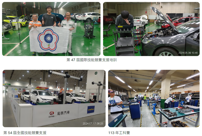為培育與選拔國內優秀的汽車修護人才,和泰汽車與經銷商每年均提供人力及支援器材,投入全國性技能競賽。2024 年我們持續贊助第54 屆全國技能競賽,並支援1 位講師4 天(8 小時/ 天)協助擔任裁判和技術顧問及檢診儀器、修護手冊各4 套,並鼓勵年輕學子投入此產業,培育產業人才資源;並協助指導選手吳宸安參加2024 年第47 屆法國里昂國際技能競賽,榮獲汽車技術職類優勝獎,增進台灣汽修技術的國際能見度,讓世界再度看見台灣;並持續支援工科技藝競賽1 位講師3 天(8 小時/ 天)協助擔任術科裁判及學科命題顧問,激勵學子勇於追求自我夢想、在技職舞台上發光發熱。