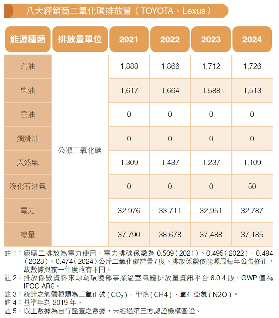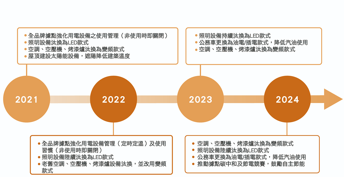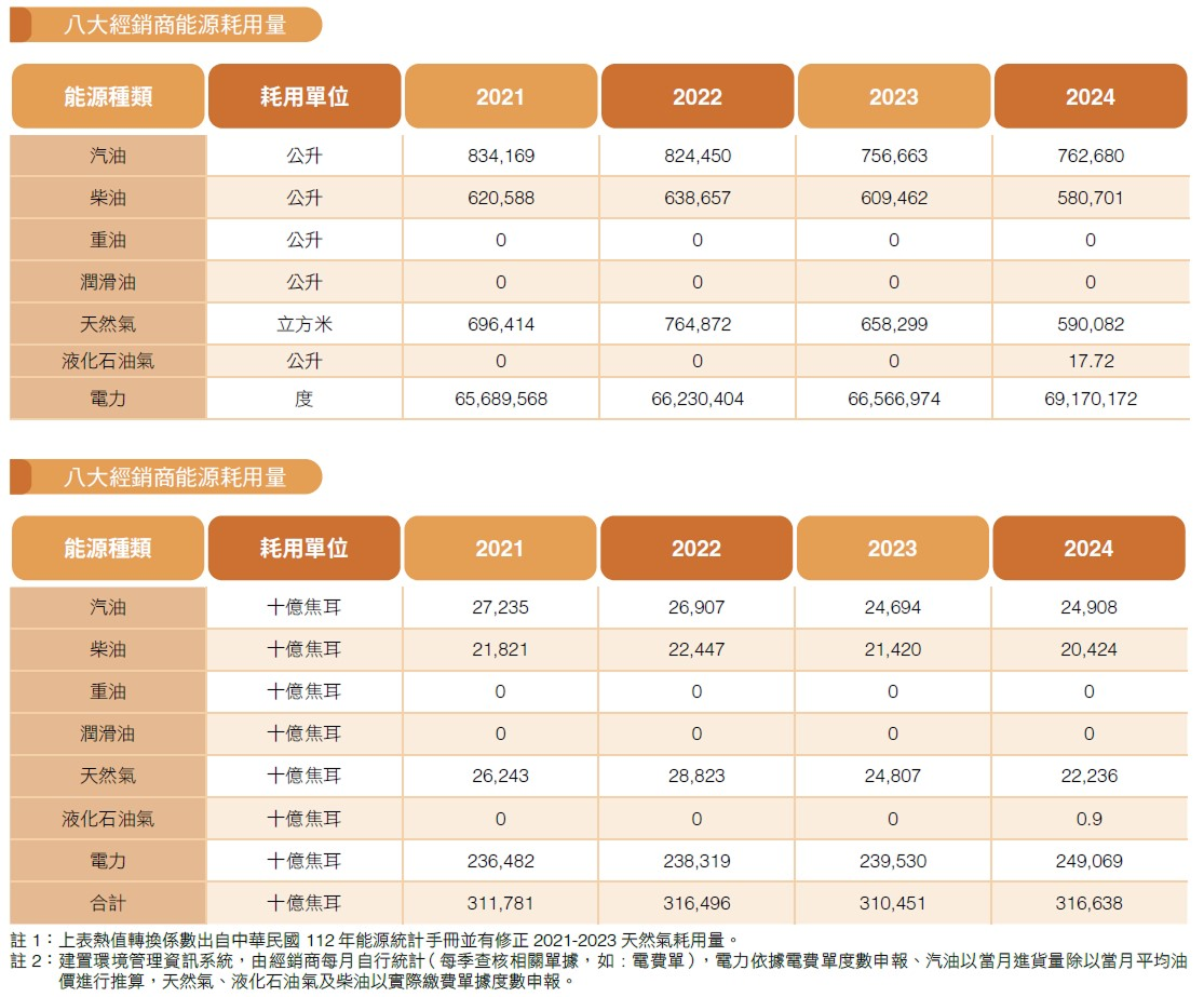 為有效管理能源的耗用,和泰 2018 年起建置環境管理資訊系統,作為管理各項溫室氣體排放源、用水及廢棄物數據登錄等之資訊蒐集平台,目前經銷商系統使用率及建檔率已達 100%。透過環境管理及檢視的過程,2018 年起推動經銷商逐步停止烤漆爐燃燒重油與潤滑油,改用柴油及天然氣,至 2019 年重油及潤滑油已無使用。2024 年八大經銷商所有用電與化石能源的使用量為 316,638 十億焦耳。