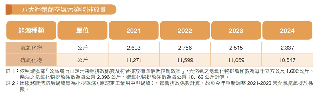 目前經銷商作業活動所產生之空氣污染物主要有氮氧化物及硫氧化物,而在減少污染物的排放量上,經銷商也自行持續導入各種設備削減空氣汙染排放。