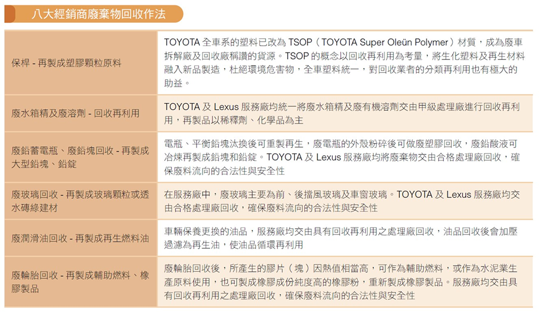和泰汽車自2003 年起致力推廣車輛廢棄物回收,目前車輛可回收廢棄物項目已全數進行回收。