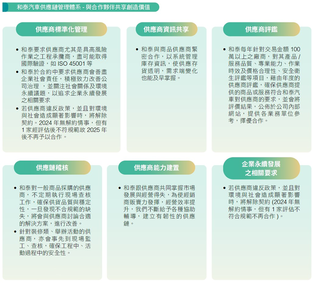 此外,我們的供應鏈管理體系以創造價值為出發點,透過「標準化管理、資訊共享、供應商評鑑、供應商稽核以及供應商能力建置」五大面向著手,除邀請供應商應重視環境與社會之永續發展,並於合約中要求供應商應配合和泰企業社會責任之相關要求,且若供應商對環境與社會造成負面顯著影響時,將不再予以合作,以提升價值鏈的永續發展能力,期望透過完整的供應鏈管理,致力於創造良好的夥伴關係,同時秉持「顧客第一」理念,持續推動「樂在TOYOTA」,全面強化經銷商體質,進而創造出超越顧客期待的服務品質。