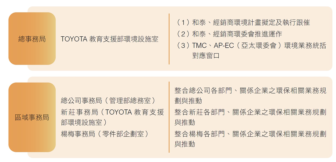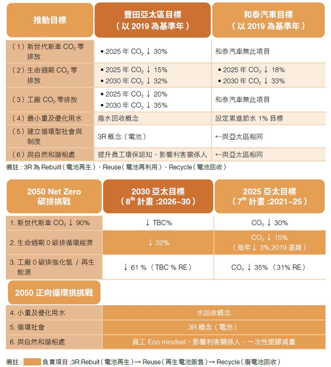 豐田母廠設定2050 年環境願景的6 大挑戰,朝向落實環境政策與產業永續發展而努力。和泰汽車以“碳中和”為終極目標,推動各項環境管理業務,逐步完成此6 大挑戰。此外還包含強化環管組織及方針管理、建立環管資訊系統、落實環保文化,以及對外揭露資訊,達成環保評鑑NO.1 的目標。