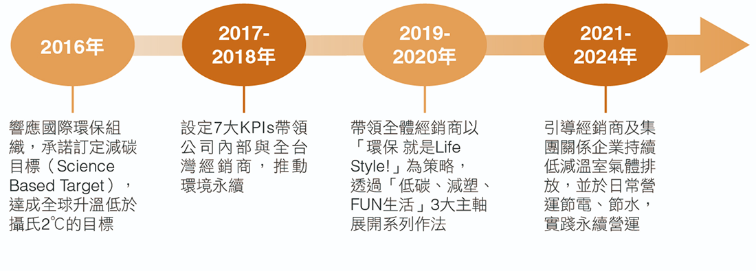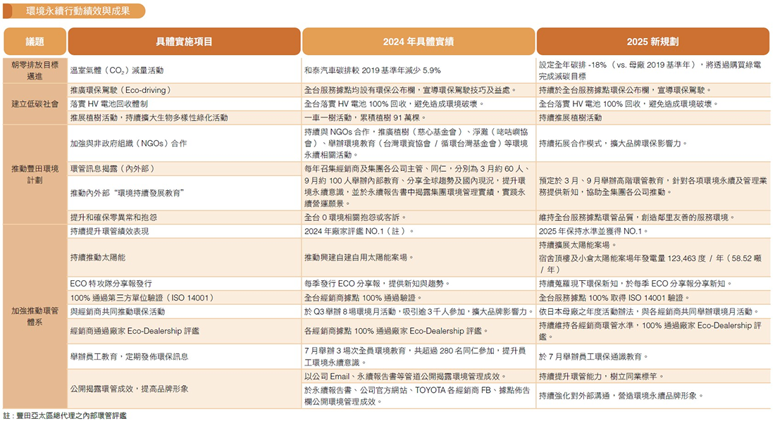 和泰汽車環管業務行動計畫於 2018 年展開,首先建立環管基礎資訊系統,檢核及追蹤環保表現數據,並強化推廣環保理念;2019-2020 年為創造環保價值,完成服務廠暑熱對應與再生能源建設,並推動示範據點;2021-2024 年則將優良範例做法推廣到其他據點及海內外和泰集團關係企業,持續擴展環管業務作為、強化環境影響力。2025 年將持續精進,逐步朝淨零排放目標前進。