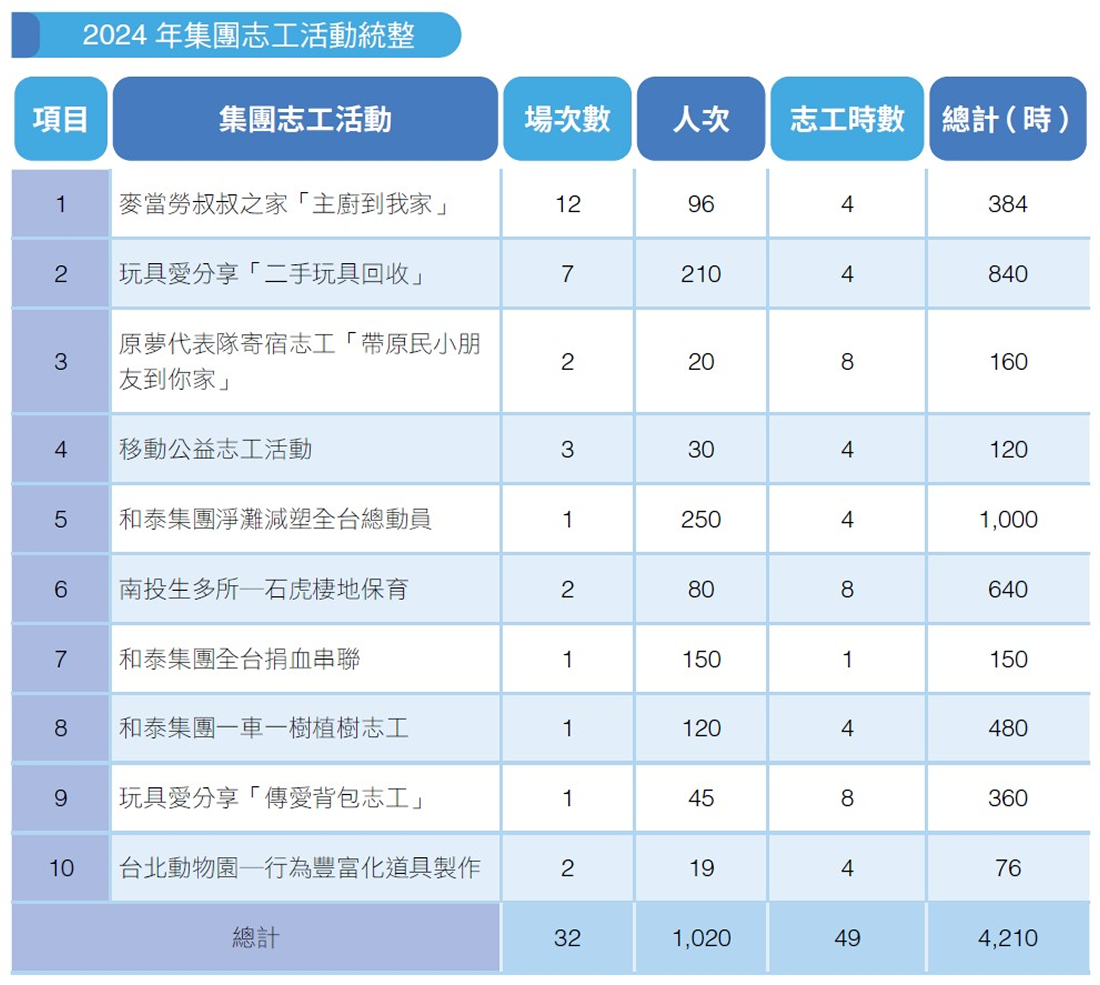 和泰汽車鼓勵員工投身從事公益行動,落實企業永續經營理念,自 2017 年起提供員工每人年度 8 小時有薪志工假,於上班時間參與內外部志工活動即可提出申請;2019 年起推廣 1 日志工假至全集團總計 20 家企業。而為鼓勵集團同仁志工活動參與,和泰汽車每年主動開辦多樣化志工活動,以符合不同同仁的興趣和專長。這些活動包括但不限於環境保護、社區服務、教育支援、公益捐助等領域。