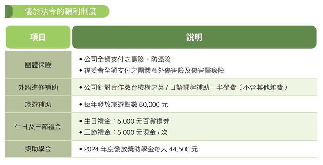 2024 年的員工總數為 579 人,男性與女性員工之平均比例約為 1.4:1,皆為正職與全職人員。年齡組成的分布上,以 30 歲以上未滿 50 歲比率最高,占48.53%;依主管/ 非主管區分,有 20.55% 為主管職。2024 年暑期實習生共有 14 位、長期實習生共有 2 位,其工作為依照所屬單位之業務協助進行專案企劃;外包派遣行政人員 23 位、清潔人員 11 位、守衛 15 位;員工與非員工總數與 2023 年相比無明顯差異。和泰汽車除聘用本國籍員工外,亦有日本籍員工,也未有因聘用歧視而引起之法律訴訟。