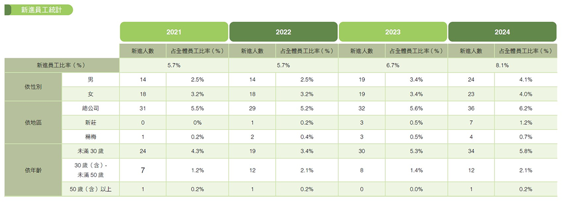 和泰汽車 2024 年共聘僱 47 位新人,佔全體員工的 8.1%,我們秉持「適才適所」與「人盡其才」的理念,致力打造友善的工作環境。透過多元管道,持續招募相關領域的專業人才,共同與和泰汽車成長茁壯。