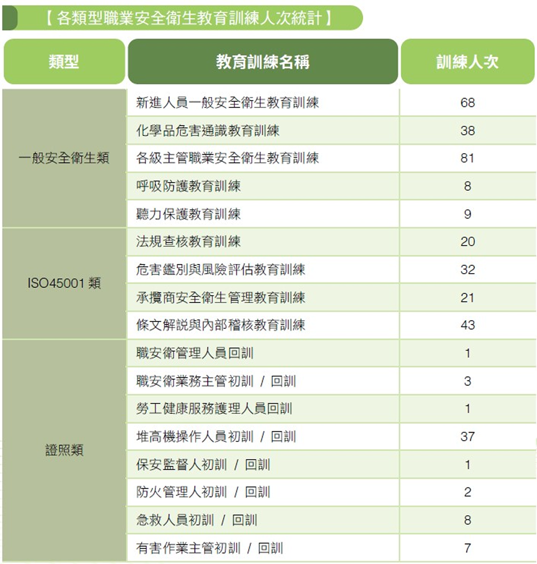 提升工作者安全衛生意識也是預防職業災害不可或缺的一環,和泰汽車每年訂有職業安全衛生教育訓練計畫,定期舉辦內部安全衛生教育訓練及安排證照人員參加外部訓練或在職回訓,以增進員工對安全衛生的認知,預防職業災害發生;本公司職安衛相關證照共計 117 張,2024 年須回訓證照計 46 張,皆已完成訓練,如期展延。2024 年教育訓練參訓人數總計 380 人次。
