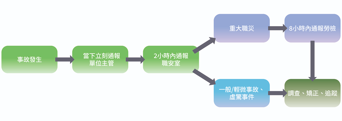 為確保職業災害發生時,相關單位能迅速反應,本公司訂有「職安衛事故調查程序」,規定所有內、外部員工及承攬商,如有虛驚事件、職業傷害或職業疾病等事故發生時,應立即採取通報、調查等程序,找出根本原因及矯正措施,以預防類似事故再次發生。根據本公司 OSH-2-011-C 職安衛事故調查程序 5.2之規定,發生重大事故 2 小時內通報職安室,重大事故以外之傷害事故及虛驚事件 24 小時內通報職安室;工作者進行通報,並不會受到任何的處分。根據本公司 OSH-3-021-A 和泰汽車職業安全衛生工作守則第 72、73 條之規定,工作場所有立即發生危險之虞時,工作場所負責人應即令停止作業,並使工作者退避至安全場所。工作者執行職務發現有前條所述立即發生危險之虞時,得在不危及其他工作者安全情形下,自行停止作業及退避至安全場所,並立即向工作場所負責人報告。