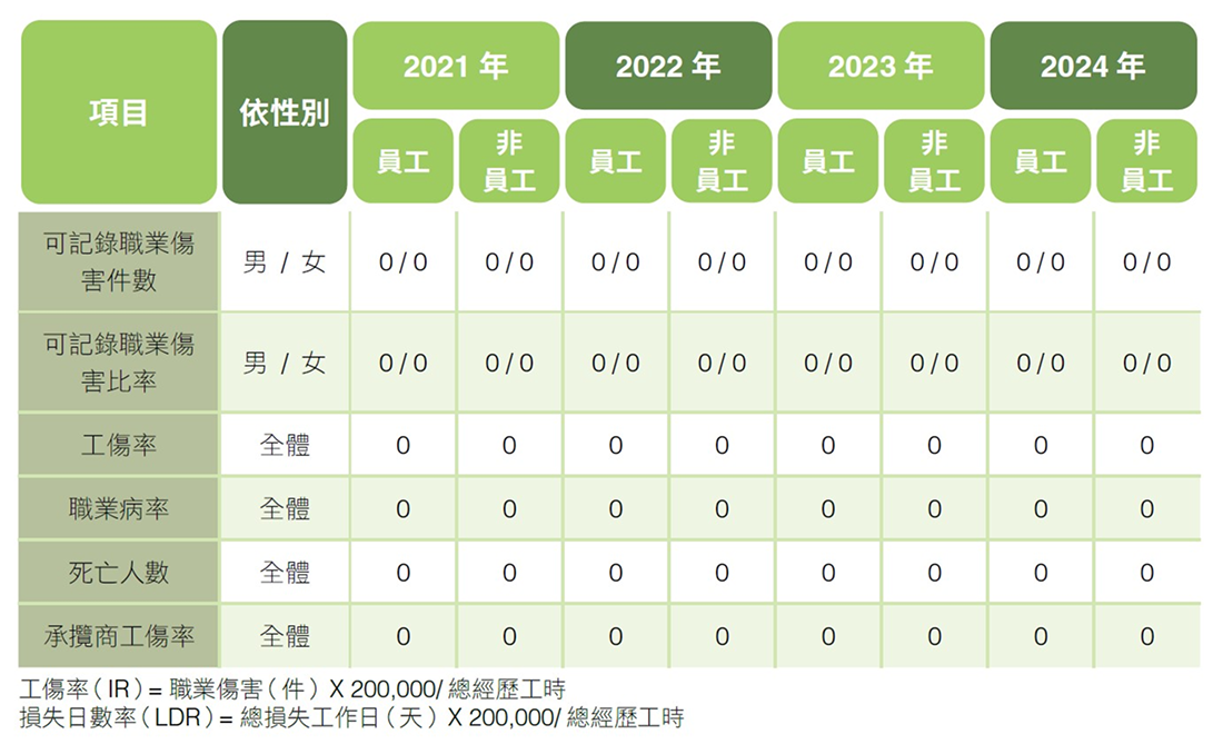 在全體同仁努力之下,和泰汽車近 5 年全體員工皆無發生職業災害,本公司將持續努力營造安全之工作環境、強化人員安全衛生觀念,維持零災害的安心幸福職場。