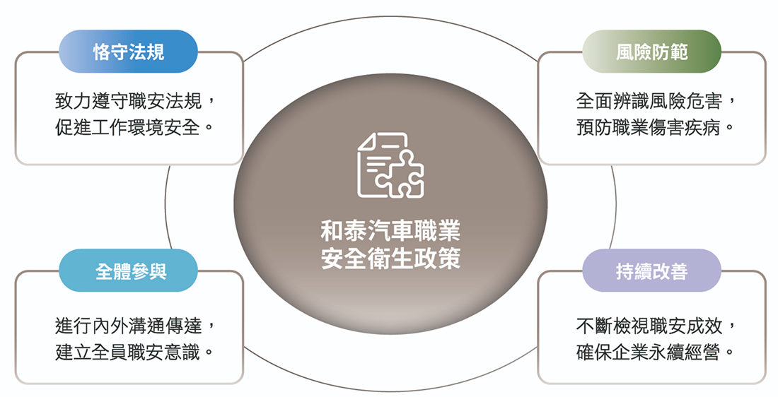 和泰汽車秉持著「跳脫框架、凌駕夢想」的精神,提供顧客優質車輛與感動服務,同時不斷挑戰極限、超越自我,以「保護員工工作安全」、「促進工作環境衛生」、「關懷員工身體健康」為目標,持續改善提高職業安全衛生績效,達到永續經營、持續服務的願景,並努力達成以下承諾: