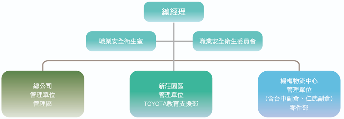 和泰汽車設有職業安全衛生委員會,每三個月定期召開會議,由總經理擔任主任委員,偕同各園區主管與勞工代表共19 員(其中勞工代表8 人),共同審議、協調、建議各項安全衛生業務推展情形,及督導安全衛生管理成效。本公司所有人員(包含員工及派遣、承攬人員)皆可透過職業安全衛生信箱、勞工代表、撥打專線或是親臨辦公室等形式,提出職業安全衛生相關議題或建議事項,職安室會定期透過問卷的方式,調查利害相關者對本公司職業安全衛生相關之需求期望,後續視通報案件形態及調查結果進行處理與回覆,必要時將相關議題呈於委員會中討論。