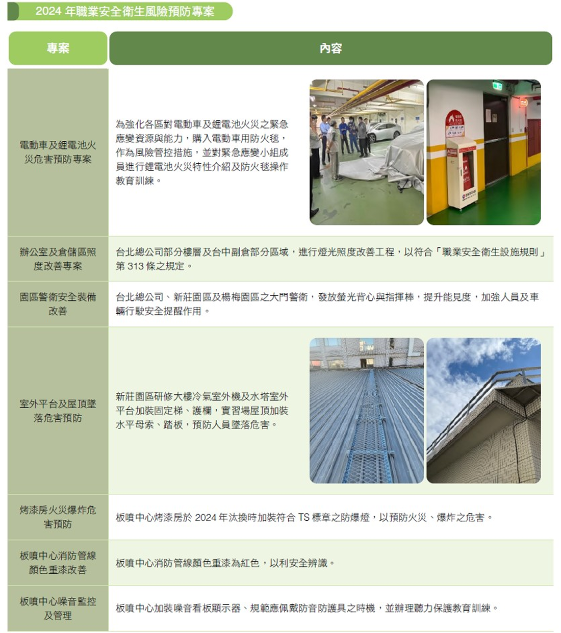 為避免危害性化學品的使用,對員工造成健康危害,本公司透過環境安全及個人安全二面向來降危害風險;化學品作業區設有整體換氣裝置、局部排氣裝置以有效移除揮發的有害氣體;依照化學品的特性選配適合之個人防護具及呼吸防護具;呼吸防護具每年安排教育訓練、密合度測試及生理評估,以確保防護具之有效性及適合性;作業現場依照法規進行危害通識措施,包含定期盤點化學品、現場備有安全資料表置於明顯易取得處、備有化學品清單並適時更新、化學品容器張貼 GHS 標示;針對高危害或高運作量之優先管理化學品,每年定期申報,以掌握廠內高風險化學品之重點管理機制;廠區每半年定期委託勞動部認可之監測機構進行作業環境監測,以掌握作業環境中危害因子之逸散情形,監測計畫書經外部工礦衛生技師簽證,於監測前召開監測評估小組會議,監測項目包含:有機溶劑、粉塵、特定化學物質及噪音,各項監測結果皆低於容許標準。