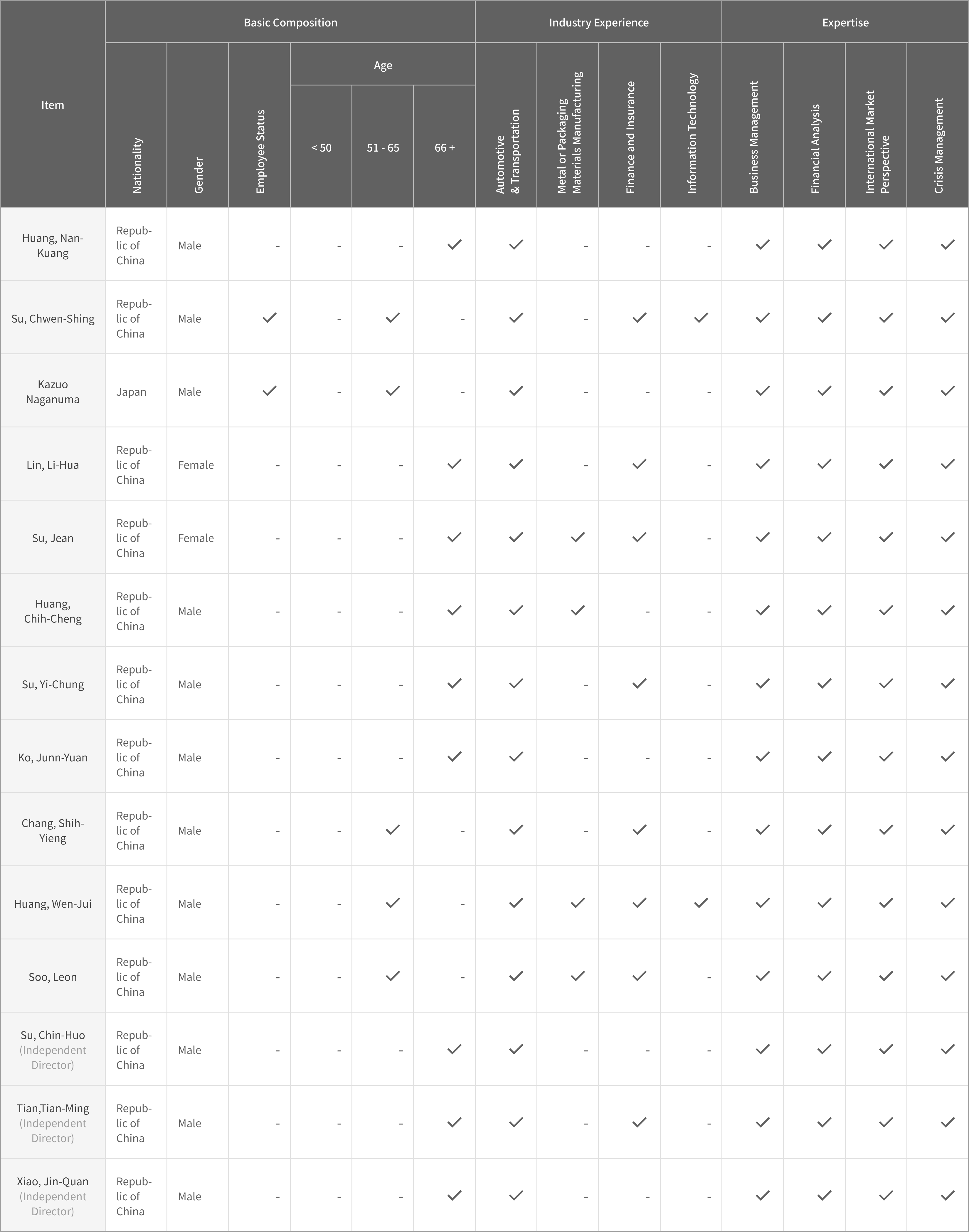 In 2025, we have a total of 14 directors, three of whom are independent directors, accounting for 21.4% of the Board. Two of the directors, President Su, Chwen-Shing and Executive Vice President Kazuo Naganuma, are also employees of the Company. Each director candidate has been reviewed for their qualifications, and it has been verified that none of the circumstances listed in Article 30 of the Company Act apply to the director candidates. The confirmation process and relevant announcements are made in compliance with applicable laws. Director profiles including relationships between members of the Board can be found in the 2024 Annual Report (fewer than half of the directors have a marital relationship with one another or are relatives within the second degree of consanguinity).
